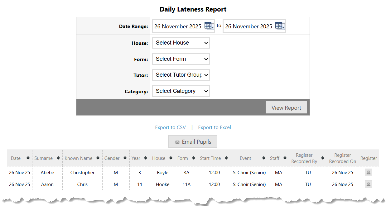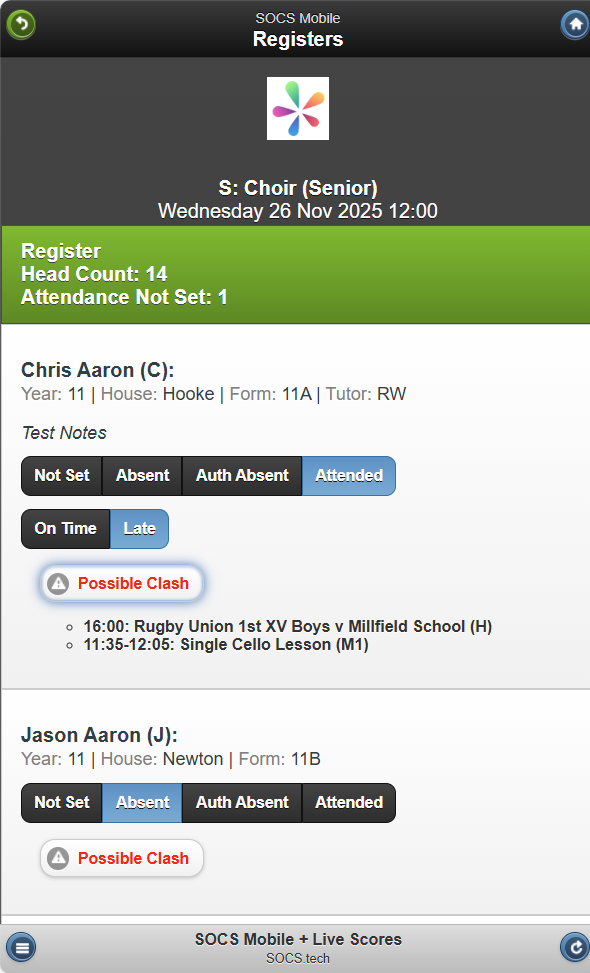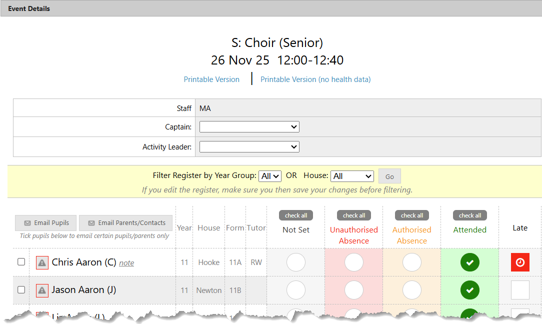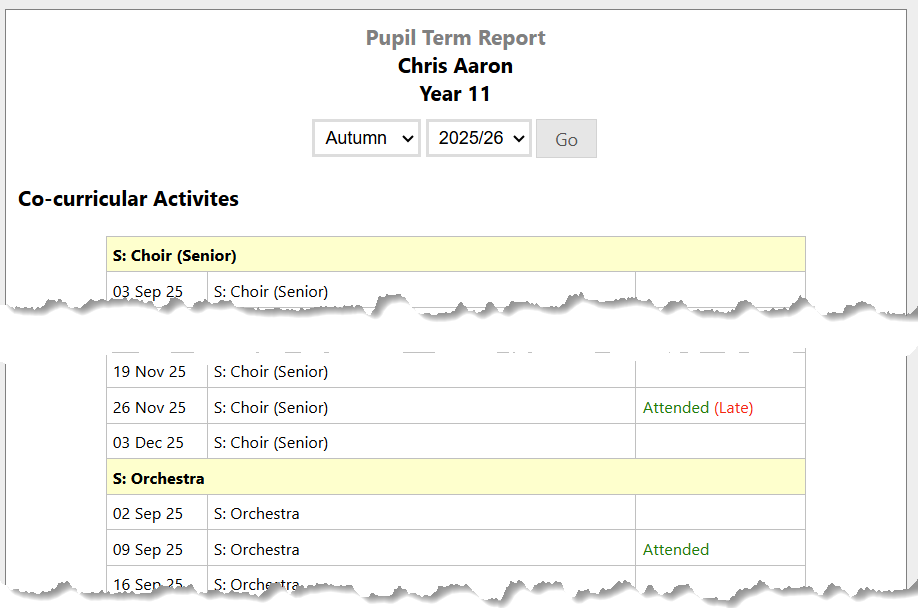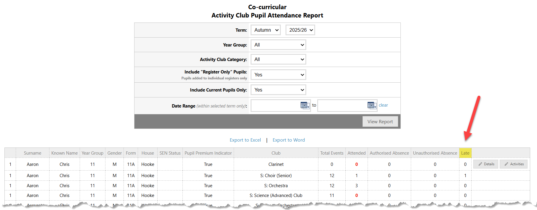 Record a pupil marked as 'Attended' as 'Late' when editing a Co-curricular register.